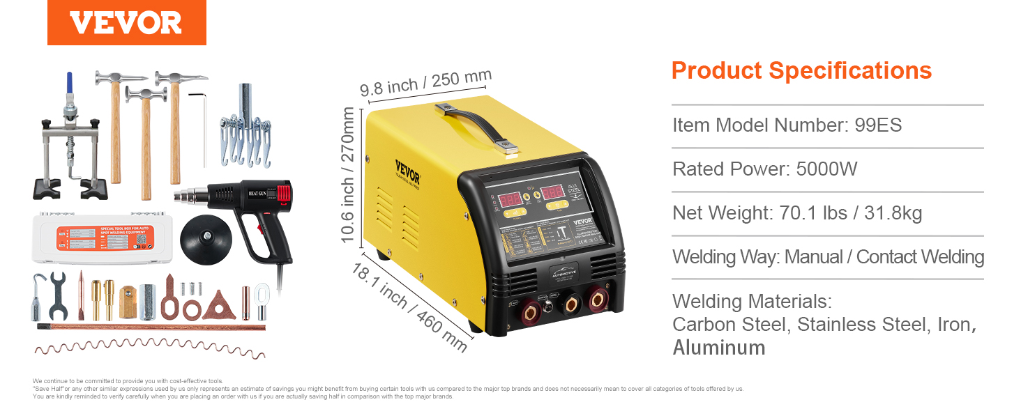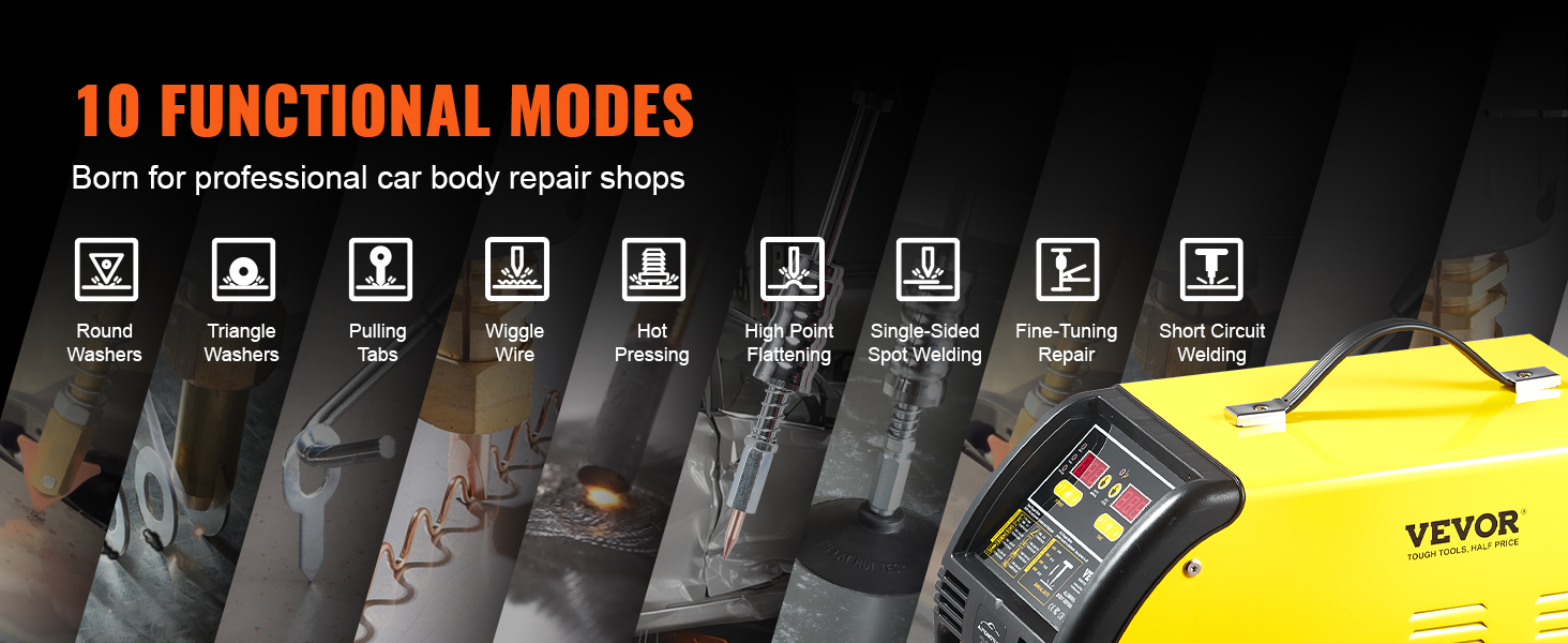 Zváračka VEVOR na vyťahovanie dutín ponúka 10 režimov vrátane jemného doladenia opravy, vyrovnávania vysokých bodov, uhlíkovej tyče, trojuholníka, kruhu, OT, kmitajúceho drôtu, jednostranného bodového zvárania, zvárania čapov, zvárania skratu. Uspokojuje rôzne potreby opráv hliníka, uhlíkovej ocele, nehrdzavejúcej ocele a železa.