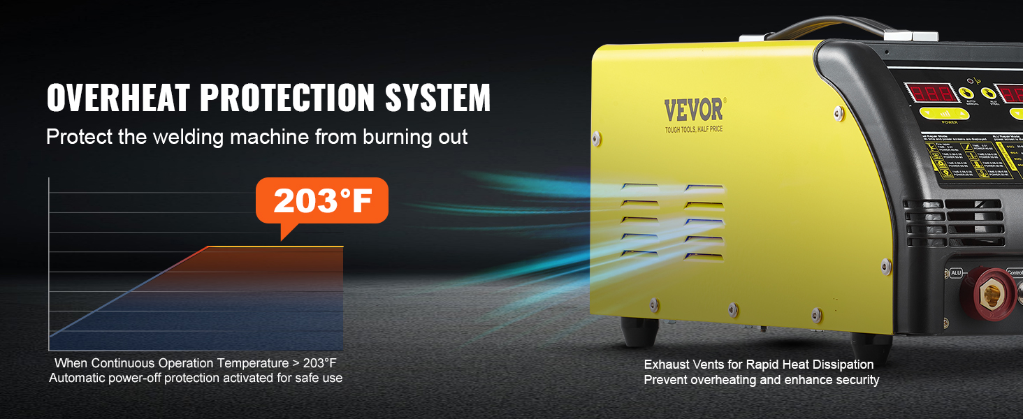 Naša bodová zváračka je vybavená inteligentným systémom ochrany proti prehriatiu, ktorý sa aktivuje, keď teplota prekročí 203℉, čím zabraňuje skratu a poškodeniu stroja. Bočné vetracie otvory tiež zabezpečujú rýchly odvod tepla, vďaka čomu je zváranie bezproblémové a bezpečné.
