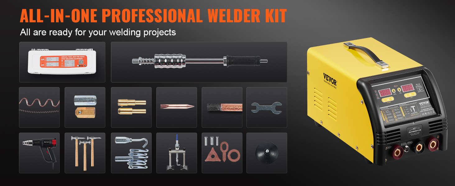 Zváračka VEVOR Dual Pro Stud Welder s výkonom 5 kW, automatickým/manuálnym režimom zvárania a 2 zváracími pištoľami poskytuje kompletné riešenie pre oceľové aj hliníkové automobilové panely. 10 režimov zvárania spĺňa širokú škálu potrieb opráv, vďaka čomu je to nástroj na profesionálne a efektívne opravy automobilov.