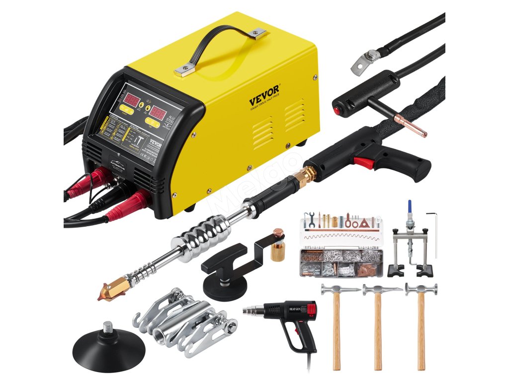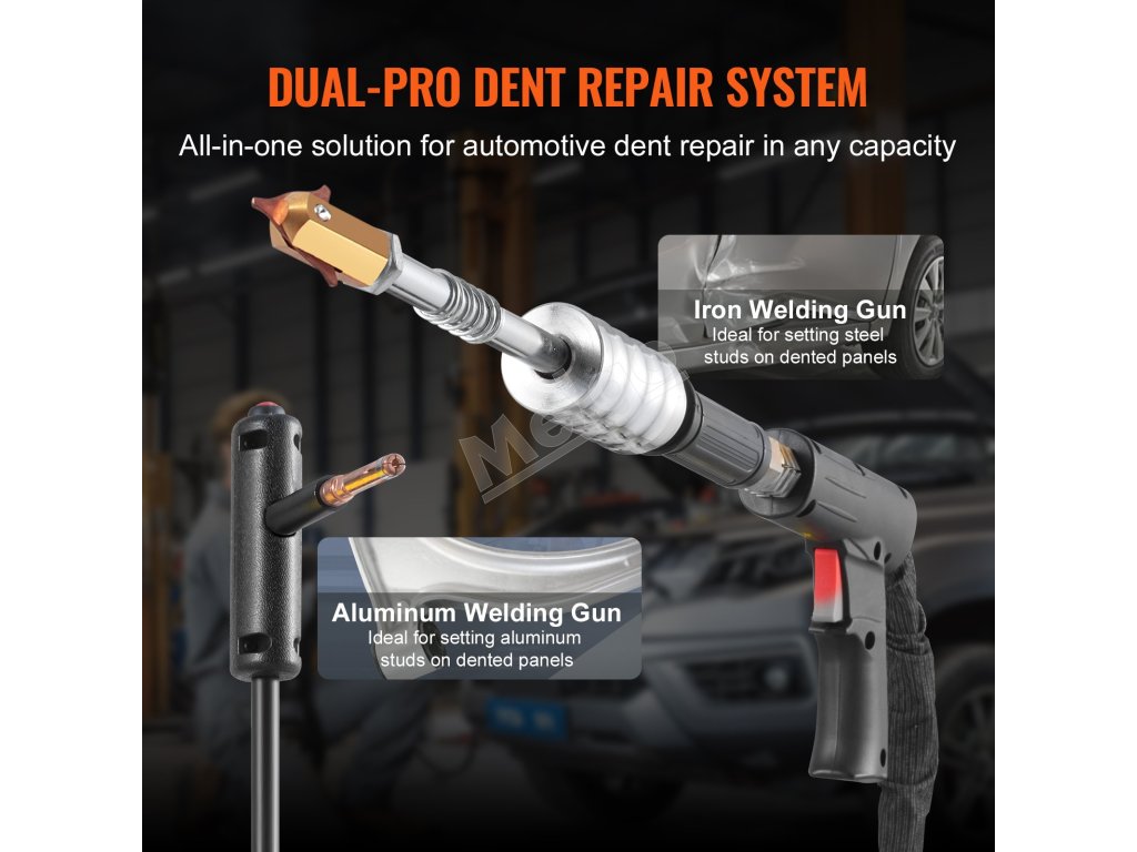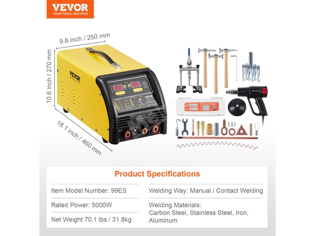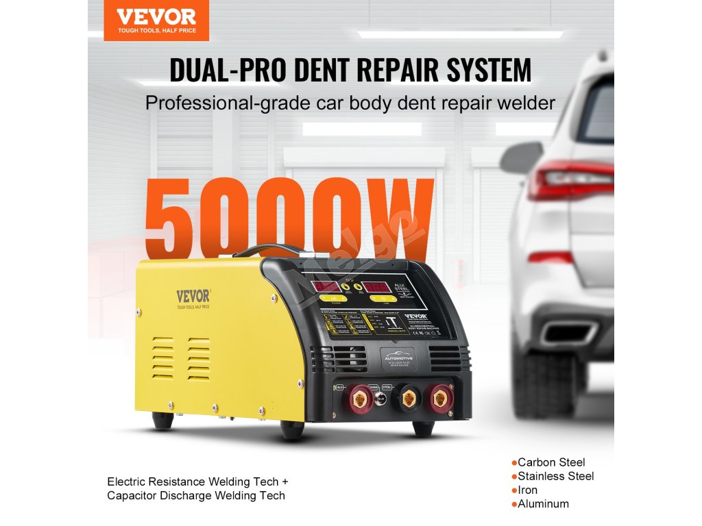 Zváračka VEVOR Dual Pro Stud Welder s výkonom 5 kW, automatickým/manuálnym režimom zvárania a 2 zváracími pištoľami poskytuje kompletné riešenie pre oceľové aj hliníkové automobilové panely. 10 režimov zvárania spĺňa širokú škálu potrieb opráv, vďaka čomu je to nástroj na profesionálne a efektívne opravy automobilov.