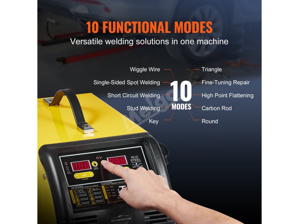 Zváračka VEVOR na vyťahovanie dutín ponúka 10 režimov vrátane jemného doladenia opravy, vyrovnávania vysokých bodov, uhlíkovej tyče, trojuholníka, kruhu, OT, kmitajúceho drôtu, jednostranného bodového zvárania, zvárania čapov, zvárania skratu. Uspokojuje rôzne potreby opráv hliníka, uhlíkovej ocele, nehrdzavejúcej ocele a železa.