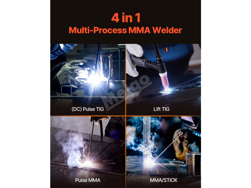 Táto zváračka TIG ponúka režimy DC Pulse TIG, DC Pulse MMA, Lift TIG a MMA/Stick, ktoré sú ideálne pre domáce a vonkajšie projekty. Zváračka TIG ľahko zvára oceľ, meď a ďalšie materiály, vyznačuje sa rýchlym zapaľovaním oblúka, kompatibilitou s viacerými procesmi a inteligentným LED displejom pre efektívny výkon.