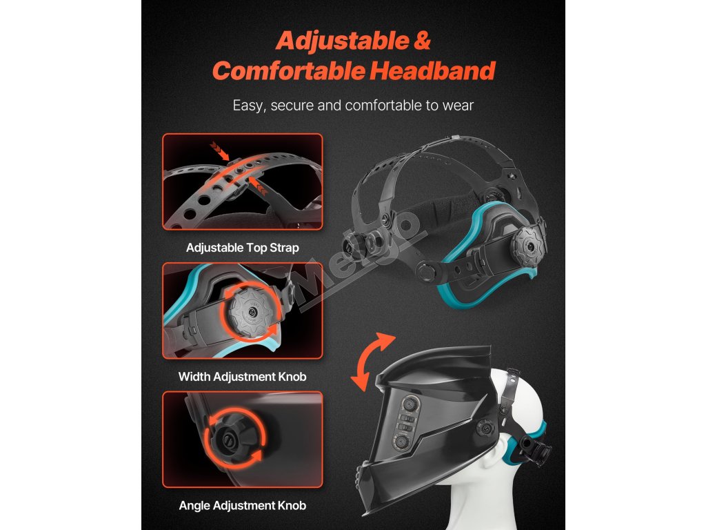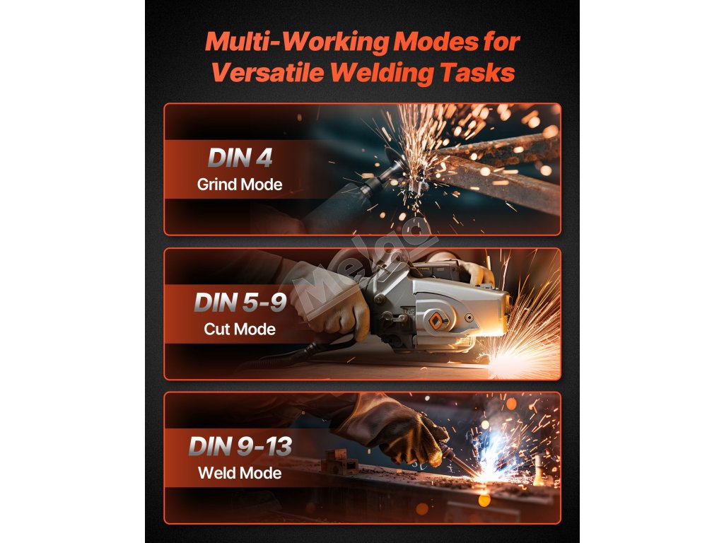 Táto zváračská prilba je vybavená nastaviteľnými úrovňami odtieňov DIN - DIN 4 (režim brúsenia), DIN 5 - 9 (režim rezania) a DIN 9 - 13 (režim zvárania) - a umožňuje vám jednoducho prepínať režimy podľa rôznych úloh, čím zvyšuje efektivitu a bezpečnosť práce.