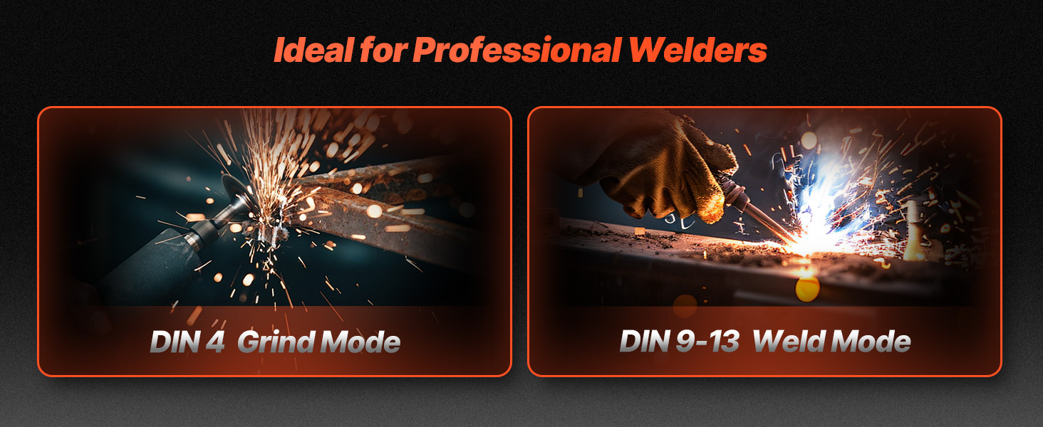 Táto zváračská prilba je vybavená nastaviteľnými úrovňami odtieňov DIN - DIN 4 (režim brúsenia) a DIN 9 - 13 (režim zvárania) - a umožňuje vám jednoducho prepínať režimy podľa rôznych úloh, čím zvyšuje efektivitu a bezpečnosť práce.