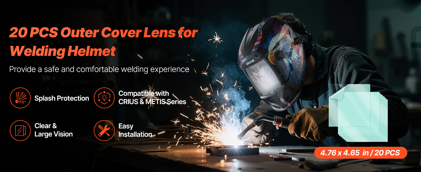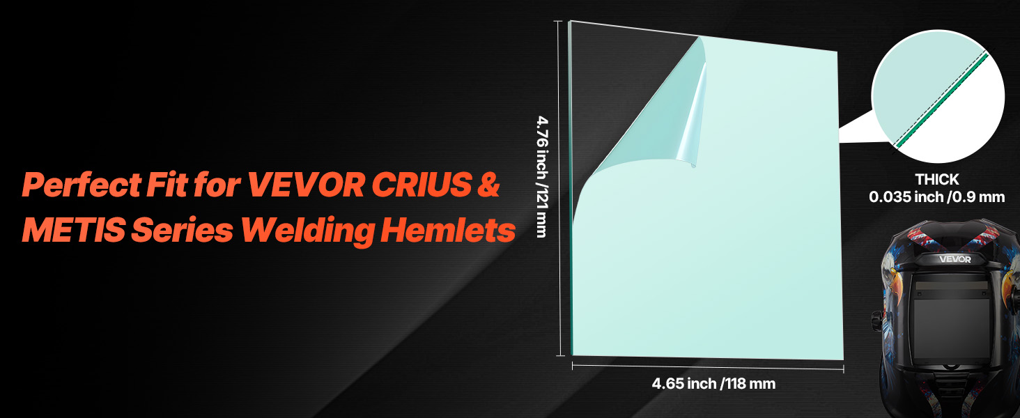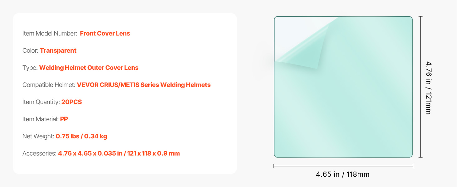 Každá krycia šošovka filtra má rozmery 4,76 x 4,65 palca (121 x 118 mm) a je kompatibilná so zváračskými prilbami VEVOR série CRIUS a METIS. Užite si bezpečné uchytenie a spoľahlivú ochranu počas každého zvárania.