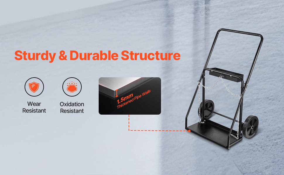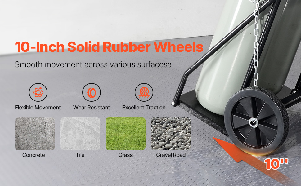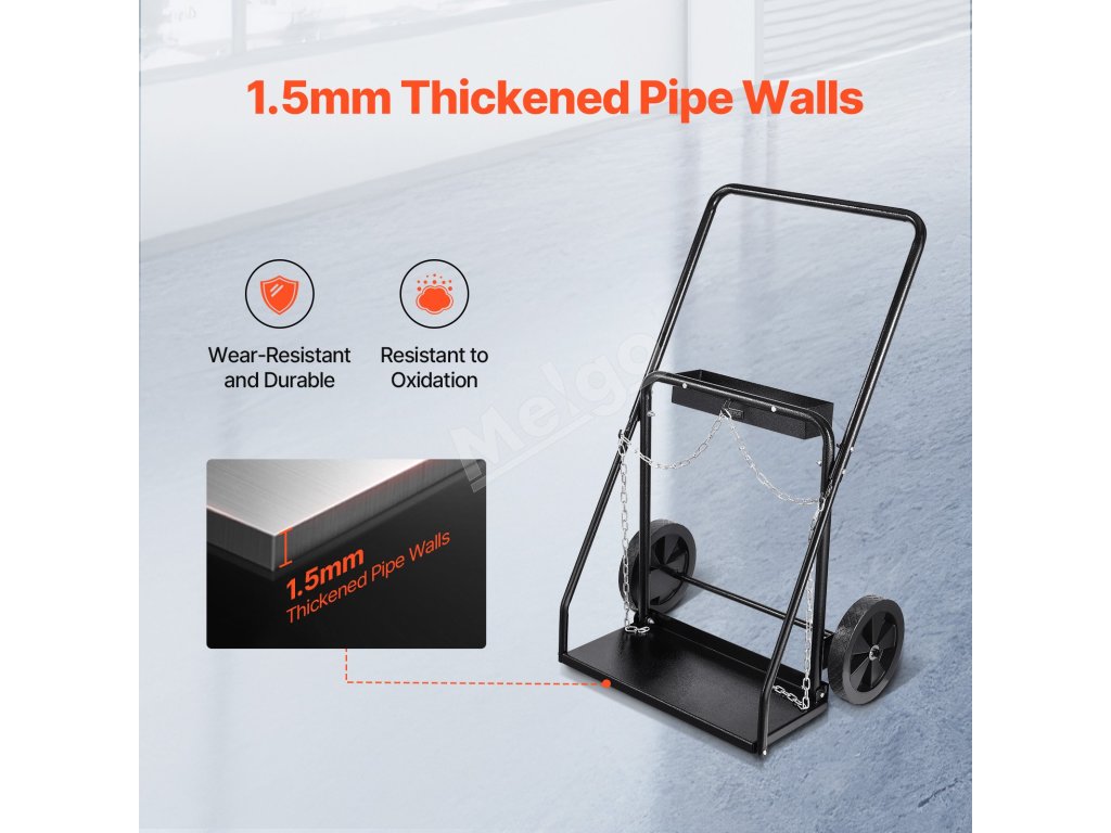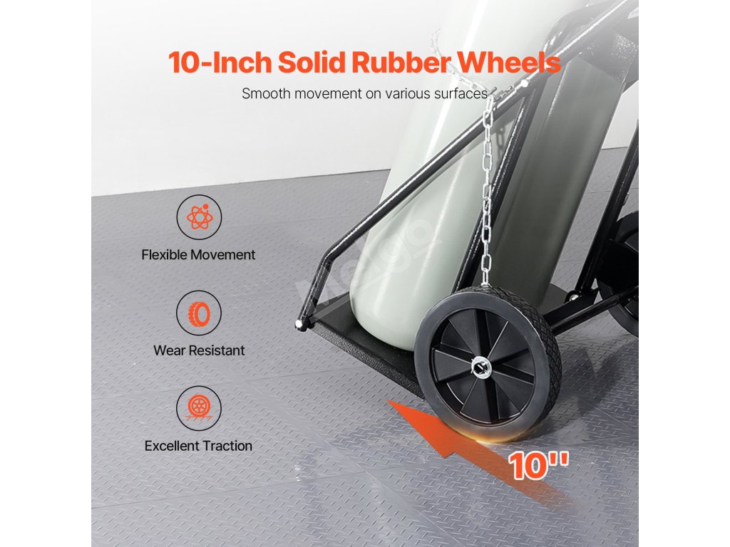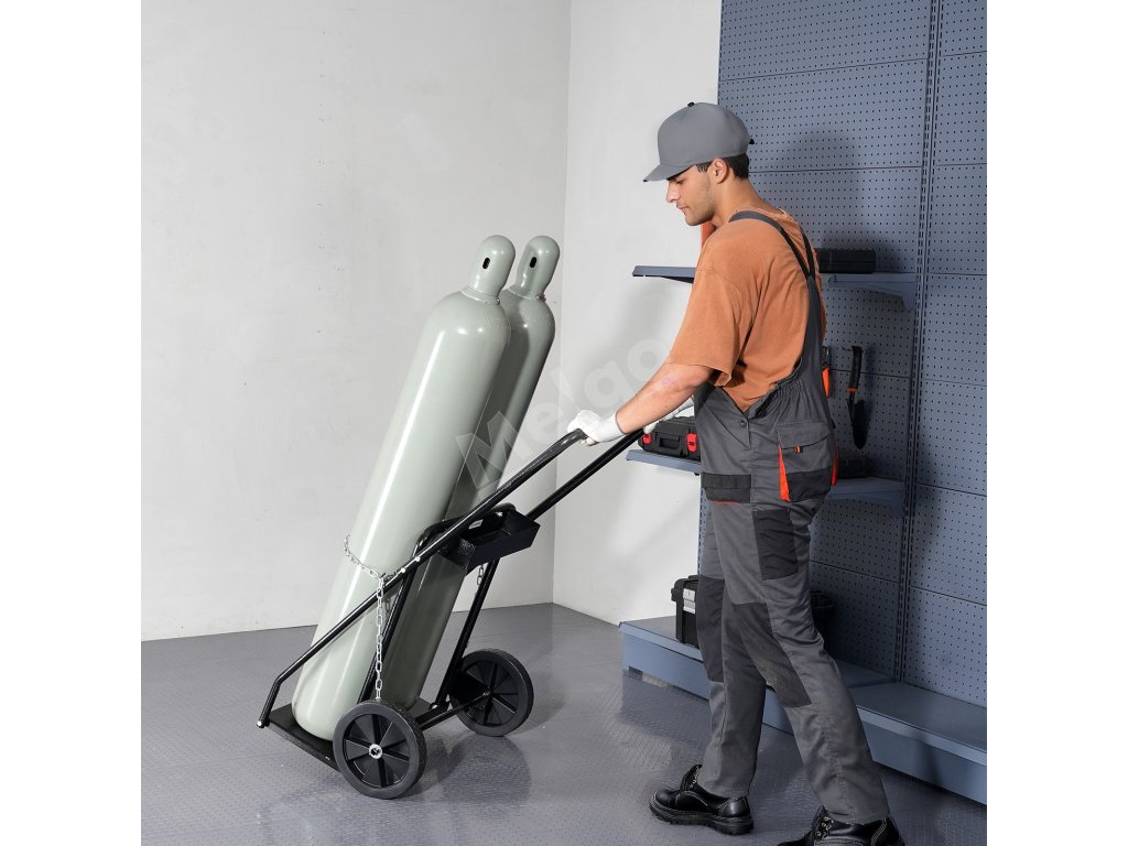 Tento vozík s kyslíkovými acetylénovými nádržami, ktorý je vybavený 10-palcovými kolesami z pevnej gumy, poskytuje mobilitu bez námahy v rôznych terénoch. Materiál odolný proti opotrebovaniu zvyšuje odolnosť a zabezpečuje plynulú a stabilnú prepravu plynových fliaš.
