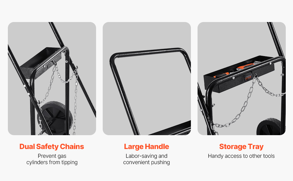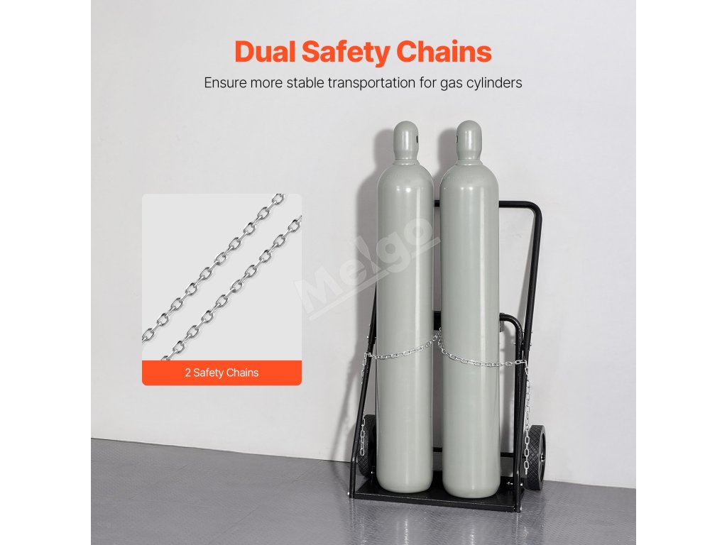 Náš vozík s dvojitou plynovou zváracou fľašou je vybavený 2 bezpečnostnými reťazami na stabilné umiestnenie plynovej fľaše, veľkou rukoväťou na úsporné a pohodlné tlačenie a odkladacia priehradka poskytuje praktický prístup k ostatným nástrojom.