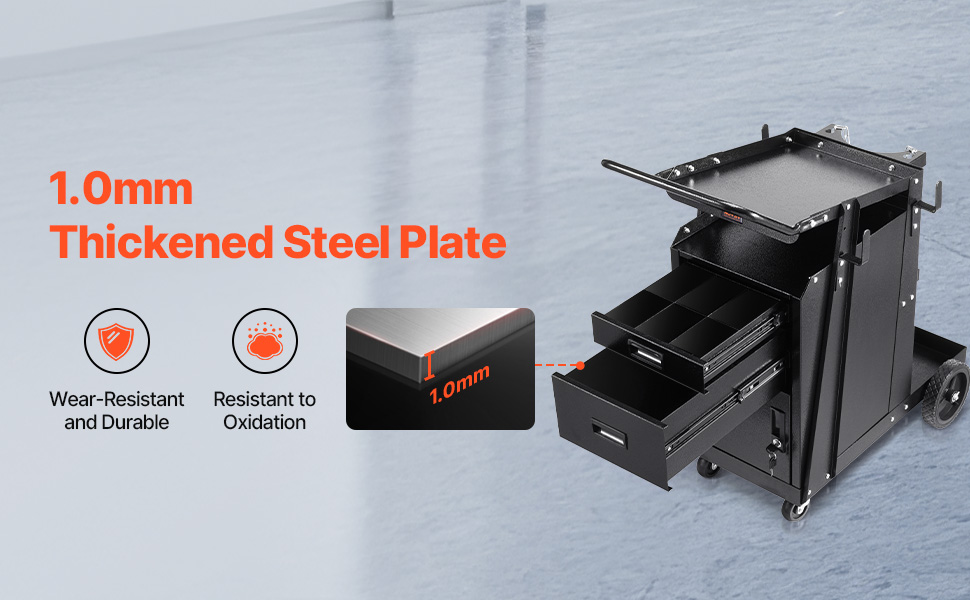 Tento zváračský vozík pre vysoké zaťaženie je vyrobený z 1,0 mm hrubého oceľového plechu, ktorý poskytuje vynikajúcu odolnosť proti opotrebovaniu a ochranu proti oxidácii. Je skonštruovaný na náročné zváračské úlohy a zaručuje dlhodobú odolnosť a stabilitu v priebehu času.