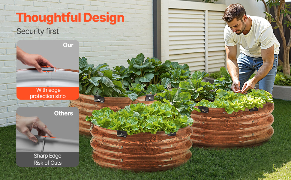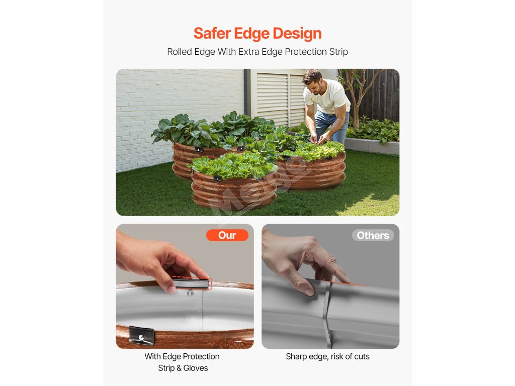 Vyvýšený záhon má zrolované okraje s ochrannými pásmi, ktoré zabraňujú poškriabaniu a zaisťujú bezpečnosť.