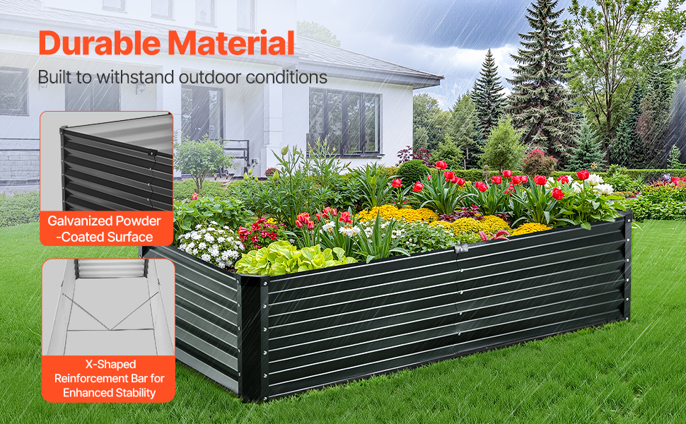 Náš vyvýšený záhradný box, vyrobený z robustného kovového rámu s povrchovou úpravou odolnou proti korózii, zaručuje odolnosť a časom zabraňuje korózii. Vnútorná výstužná lišta v tvare písmena X zvyšuje stabilitu, takže je spoľahlivý aj vo veterných podmienkach.